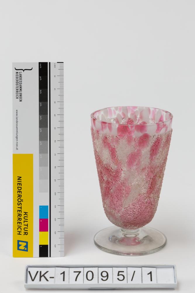 Konisches Glas mit kurzem Stiel und Standfuß; die Wandung des Glases ist an der Außenseite strukturiert, das Glas ist bis auf Fuß und Stiel mit roten, weißen und rosa Sprenkeln im Glas gefärbt.