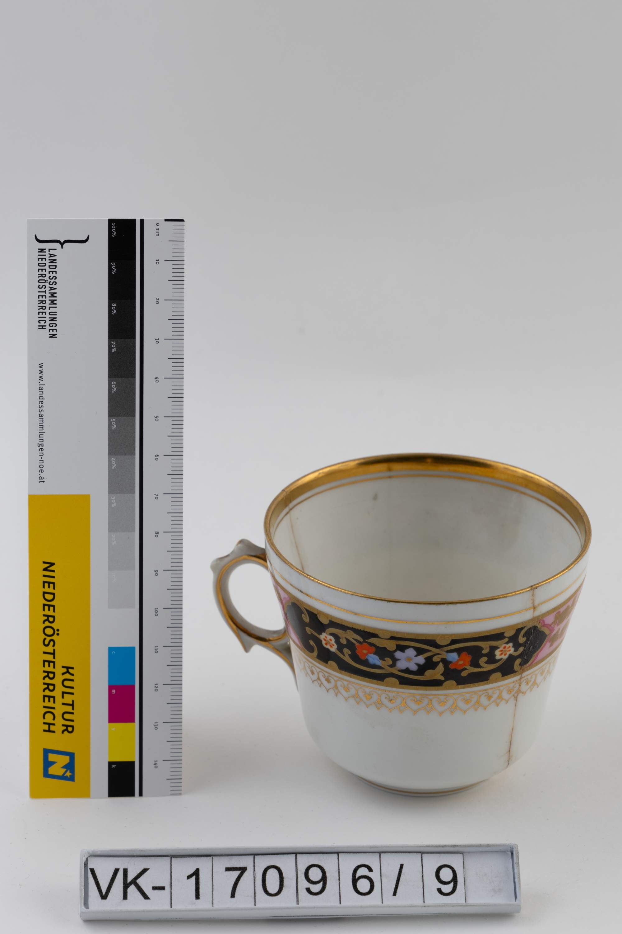 Konische Kaffeetasse aus weißem Porzellan mit unterrandständigem Henkel und Dekor: Goldlinien, vergoldeter Rand und ein umlaufendes Dekorband (je zwei schwarz und rosa hinterlegte Elemente, die mit goldenen Ranken und mehrfärbigen Blütendarstellungen verziert sind). Golddekor findet sich auch am Henkel. Am Boden ist mit Goldschrift die Zahl "77" angebracht.