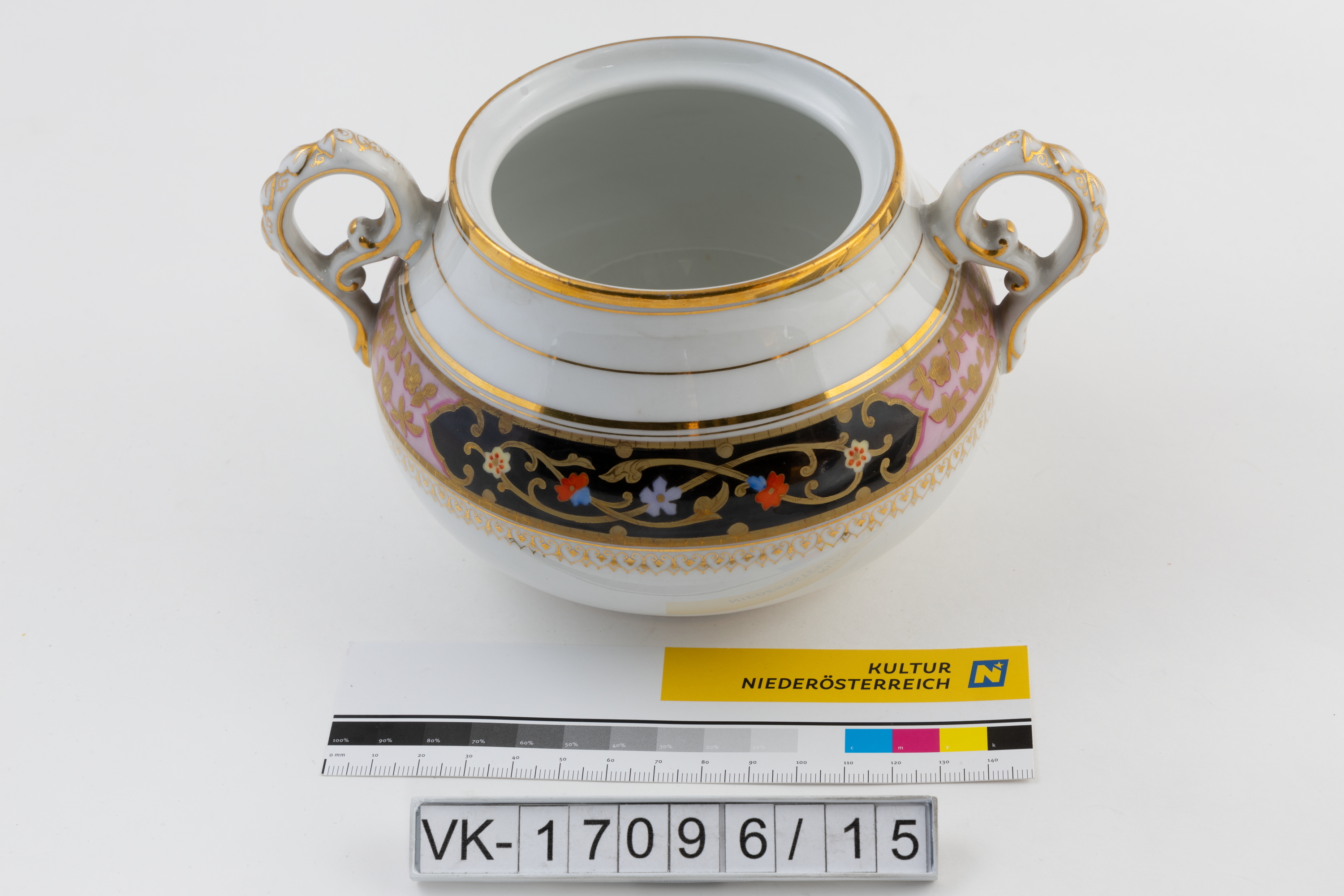 Bauchige aus weißem Porzellan mit zwei unterrandständigen Henkeln und Dekor: Goldlinien, vergoldeter Rand und ein umlaufendes Dekorband (je zwei schwarz und rosa hinterlegte Elemente, die mit goldenen Ranken und mehrfärbigen Blütendarstellungen verziert sind). Golddekor findet sich auch an den Henkeln.