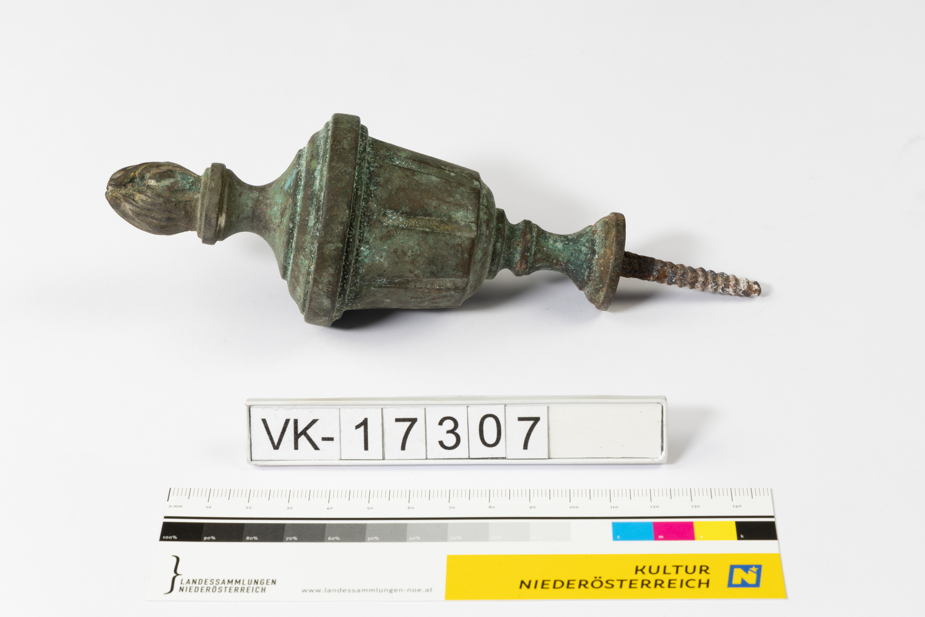 Pokalartiger Aufsatz für ein Tor oder einen Zaun mit einer unten herausragenden Gewindestange zum Verschrauben.