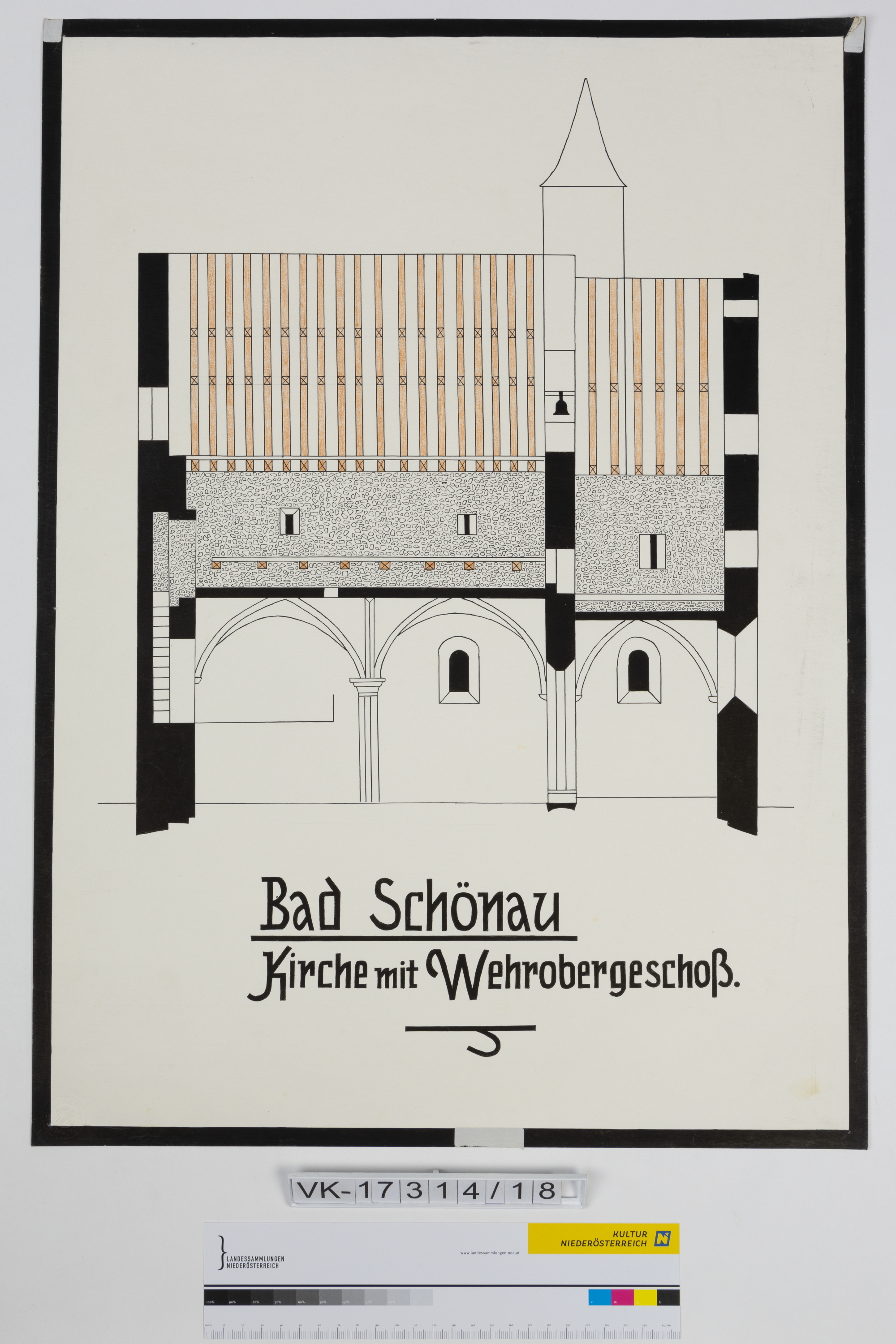 Schautafel mit Zeichnung und Text: Kirche mit Wehrobergeschoß Bad Schönau.