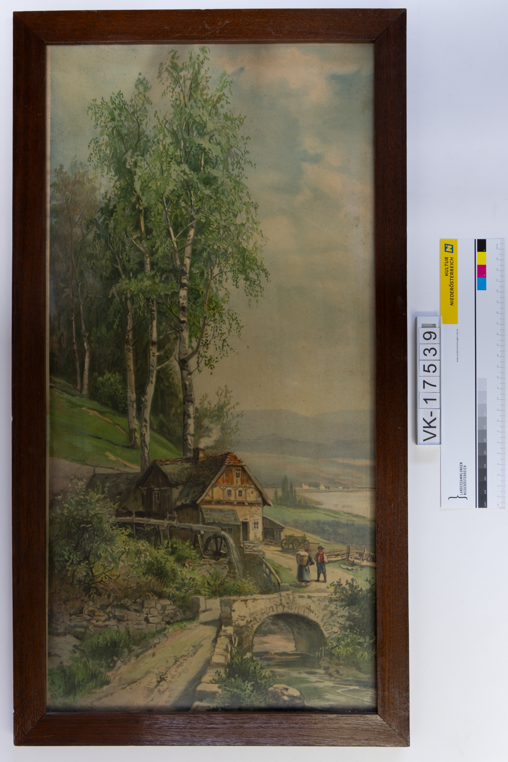 Mehrfärbiger Druck in einem braunen Holzrahmen hinter Glas: Das Bild zeigt eine Landschaftsansicht mit Birkenwald, einer Mühle mit Mühlbach und Brücke und zwei Personen.