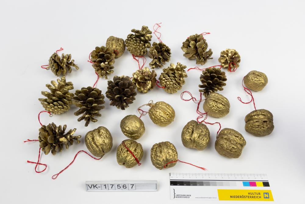 Sack mit gold lackierten Tannenzapfen und Nüssen mit roten Bändern.