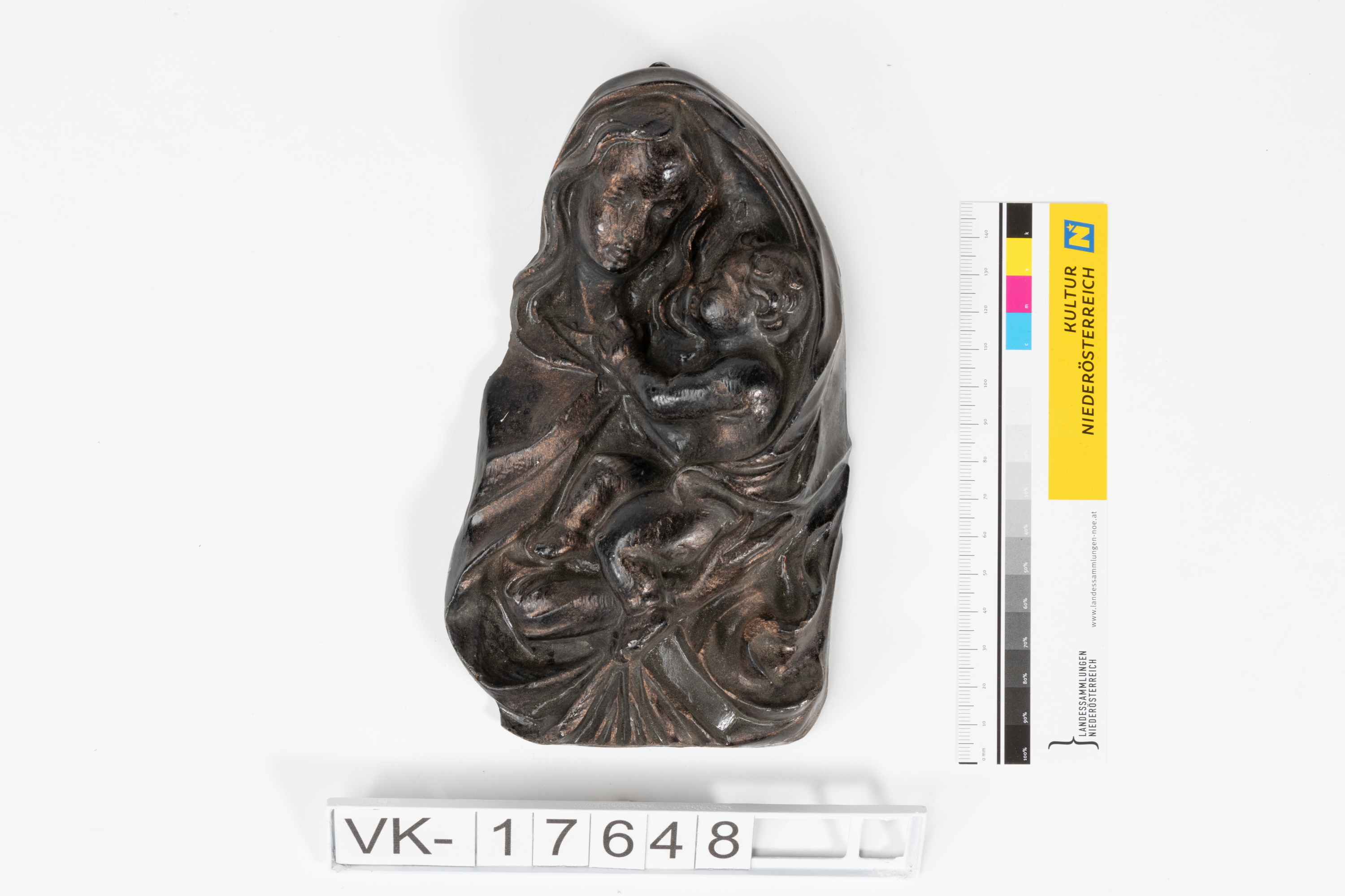 Aus Gips gegossene und lackiertes Relief: Maria mit Kind.