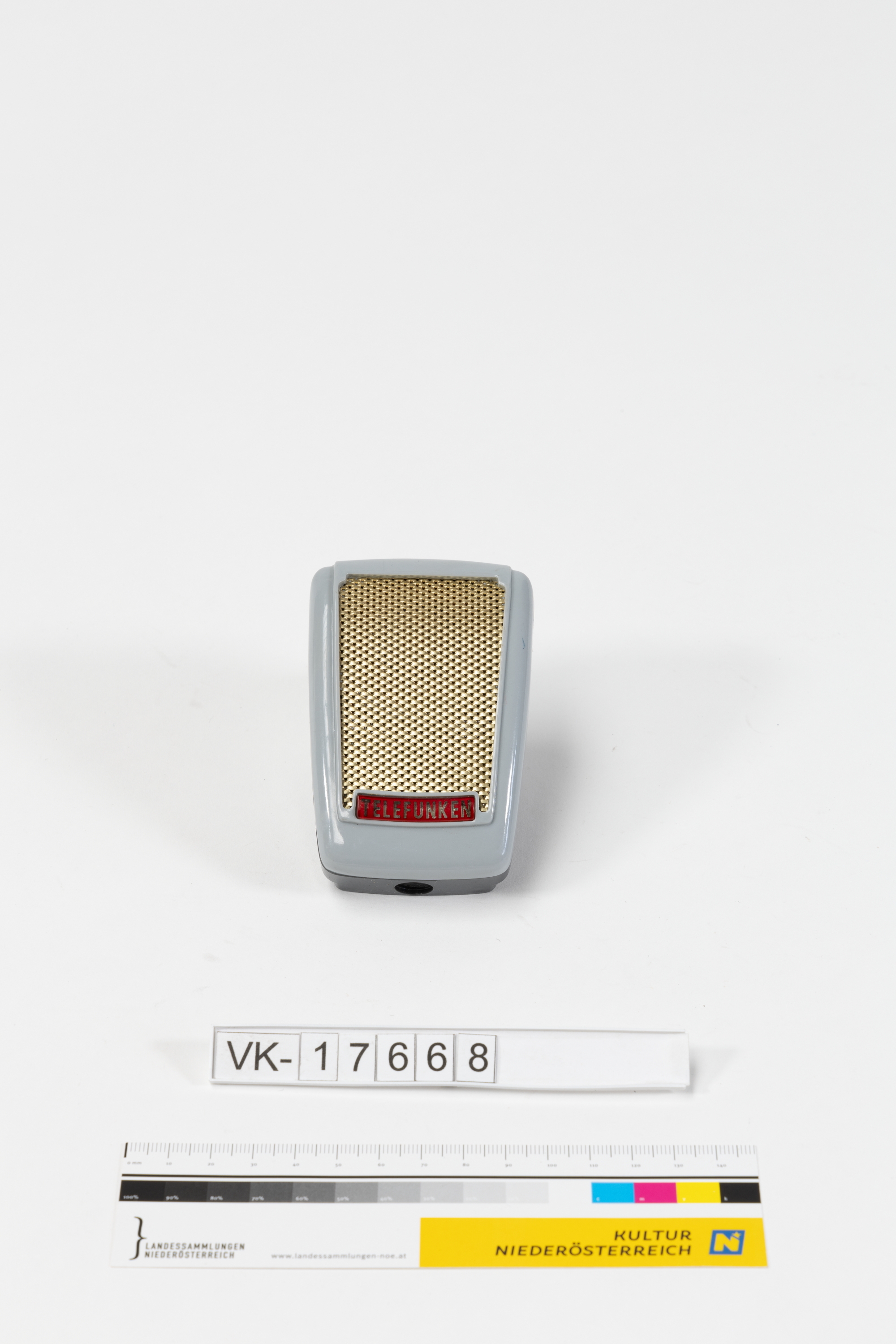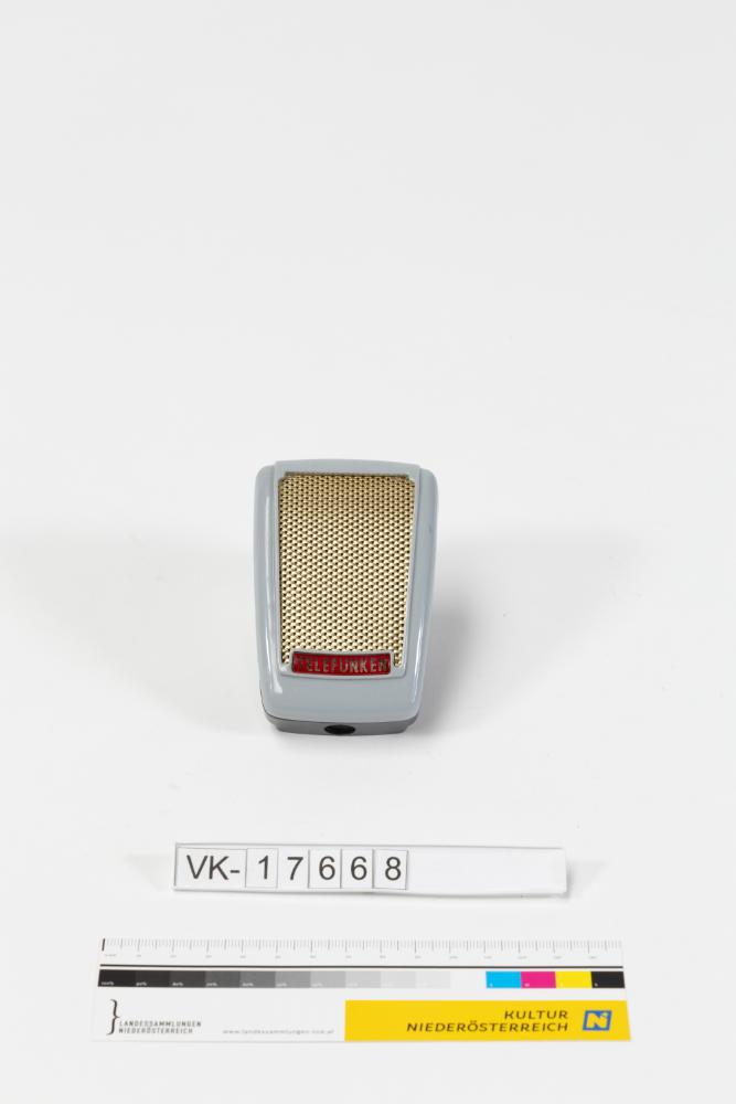 Quaderförmiges Mikrofon mit Messinggitter aus grauem Kunststoff mit der Aufschrift: "TELEFUNKEN".