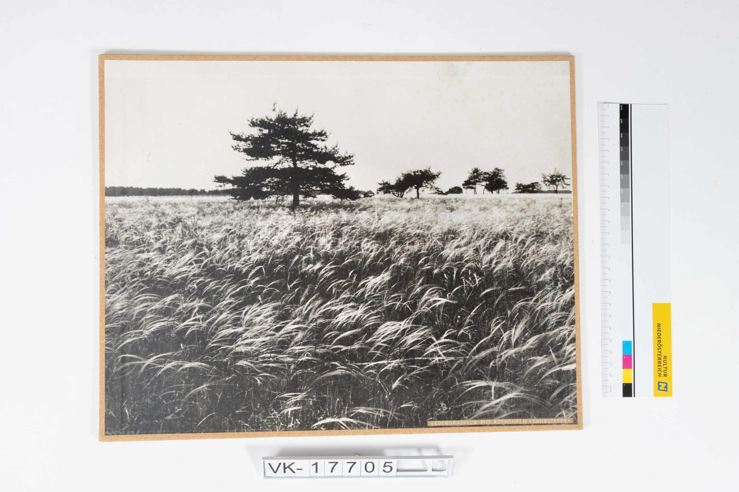 Schwarz-Weiß-Fotografie mit Darstellung einer Wiese mit Bäumen und einer Beschriftung: "FEDERGRASFLUR MIT ROTFÖHREN (SANSTEPPE)".