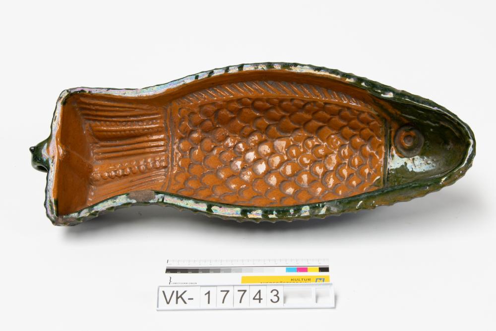 Innen hellbraun und außen grün glasierte Backform in Form eines Fisches.