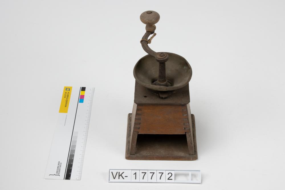 Kaffeemühle mit einem Holzbehälter (mit trapezförmigen Seitenteilen), einem Trichter aus Blech und einem gusseisernen Mahlwerk mit einer Kurbel mit Holzknauf.
