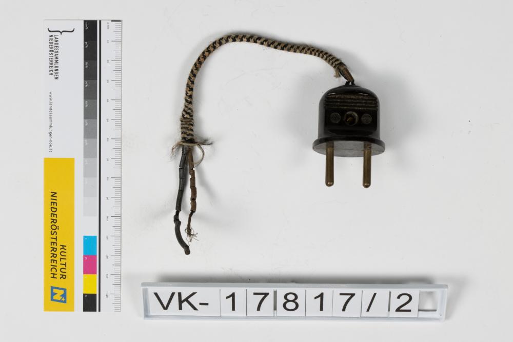 Schwarzer Bakelitstecker mit einem Stück eines textilummantelten Kabels.
