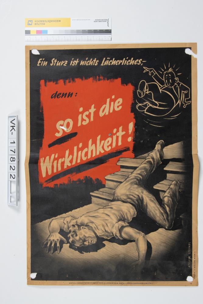 Zweifärbig gedrucktes Plakat der Allgemeinen Unfallversicherungsanstalt zur Warnung vor den Gefahren eines Sturzes.