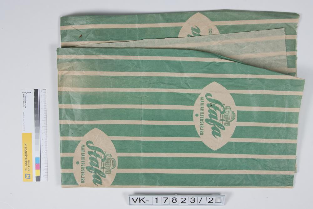 Ein Bogen Packpapier, grün gestreift mit linsenförmigen Firmenzeichen "Stafa MARIAHILFERSTR. 120".