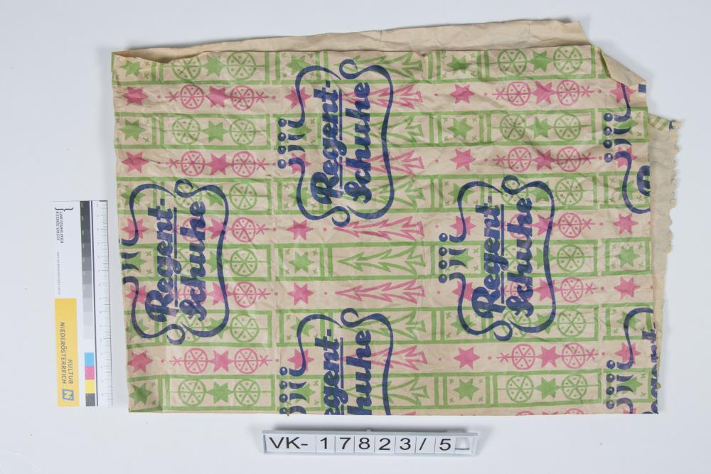 Ein Bogen Packpapier, mehrfärbig bedruckt, mit weihnachtlichen Motiven (Sternchen, Bäumchen) und dem Firmenzeichen: "Regent-Schuhe".