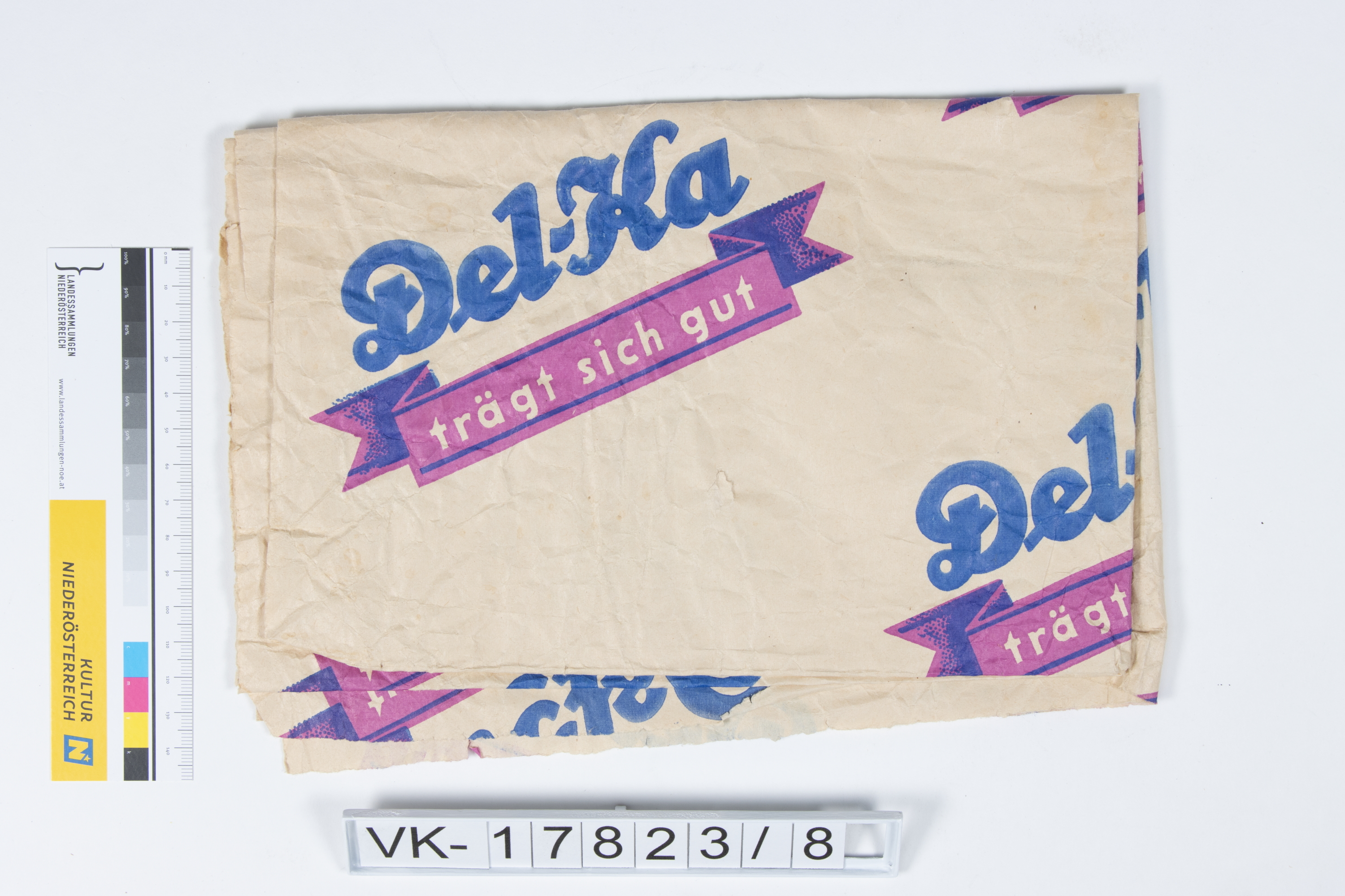 Ein Bogen Packpapier, mehrfärbig bedruckt, mit Firmenzeichen: "Del-Ka trägt sich gut".