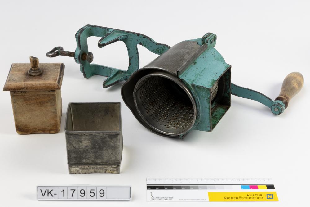 Reibe (VK-17959a) mit Tischplattenklemmung, hölzernem Kurbelgriff und aufgesetztem Zuführschacht (VK-17959b) mit hölzernem Nachführer (VK-17959c). Die Maschine ist großteils blaugrün lackiert und hat auf der Rückseite eine Herstellerbeschriftung: "GUST. GORGOSCH TESCHEN".