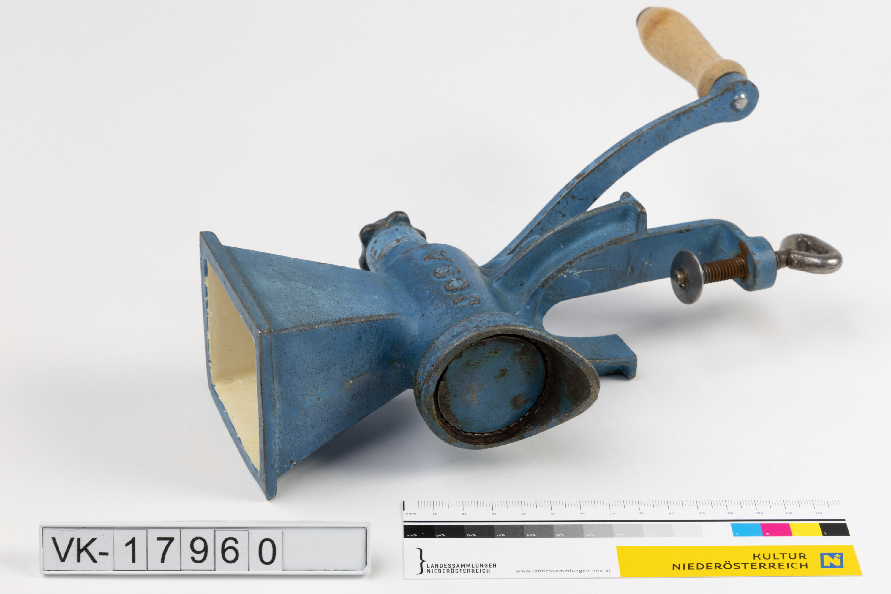 Kleiner Fleischwolf mit Tischklemmung, konischem Zuführtrichter und einer Kurbel mit Holzgriff. Das Gerät ist blau lackiert und trägt auf einer Seite die Herstellerbezeichnung "JOSA".