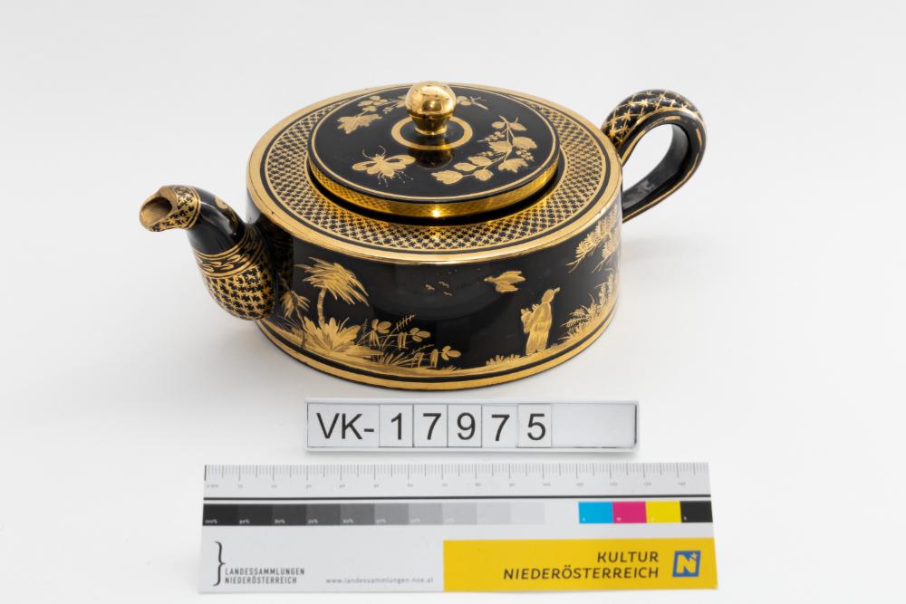 Teekanne (VK-17975a) aus schwarzem Glas mit Deckel (VK-17975b). Kanne und Deckel sind mit asiatischen Motiven (Personen, Pflanzen, ein Tempel, ein Vogel) verziert.