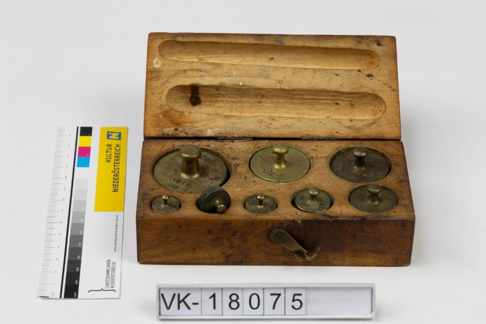 Holzkistchen (VK-18075a) mit sieben unterschiedlich schweren zylindrischen Gewichten (VK-18075b bis VK-18075i).