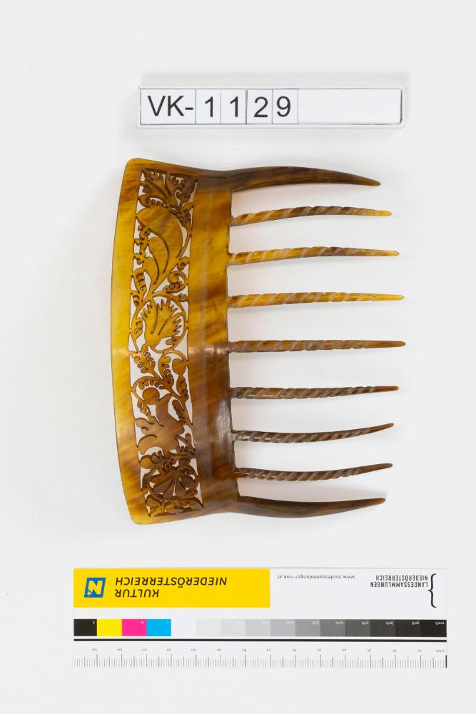 Halbrunder Steckkamm aus Horn, Kammkrone durchbrochen floral gestaltet. Der Kamm hat neun Zinken, sieben davon sind gedreht ausgeführt.