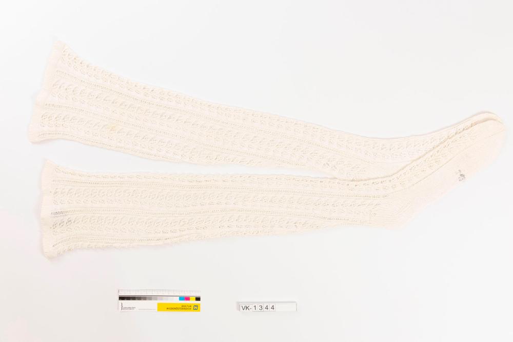 Ein Paar (a, b) weiße, mit durchbrochenem Muster gestrickte Damenstrümpfe.