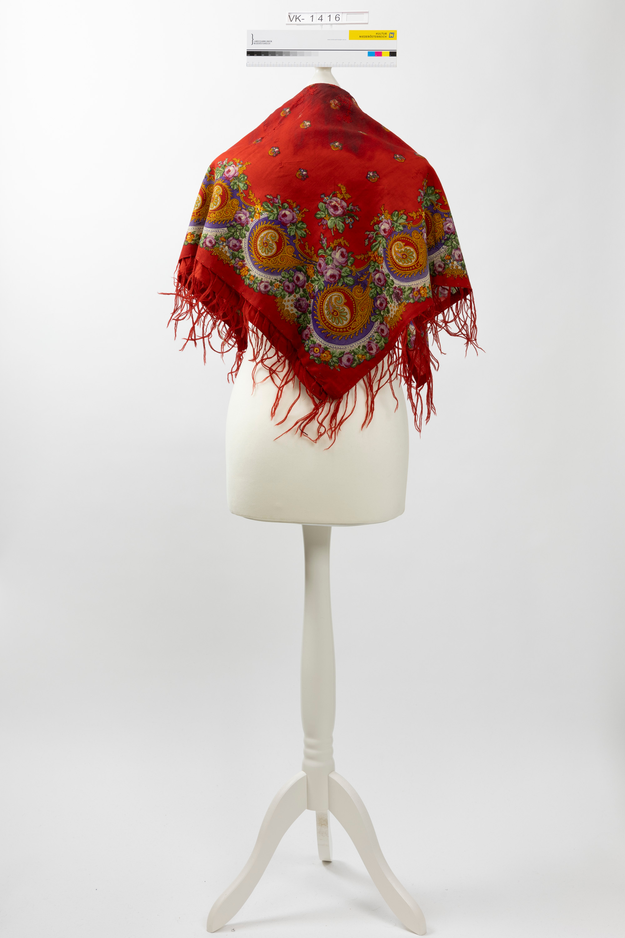 Tuch mit roter Grundfarbe und kleinen goldenen Blümchen im mittleren Bereich; den Randbereich ziert eine Reihe mehrfärbig ornamental und floral gestalteter Medaillons. Das Tuch hat an allen Seiten geknüpfte Fransen.
