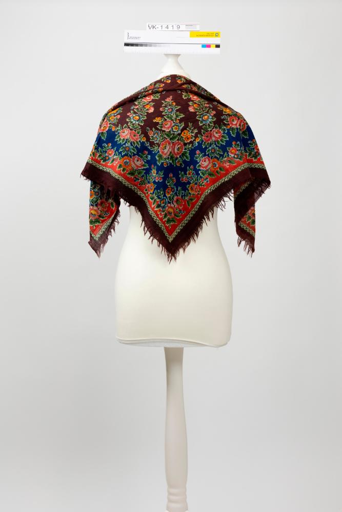 Dunkelrotes Tuch mit mehrfärbigem Druck: Blüten und Blattwerk, die zur Mitte des Tuchs hin sternförmig zusammen laufen.