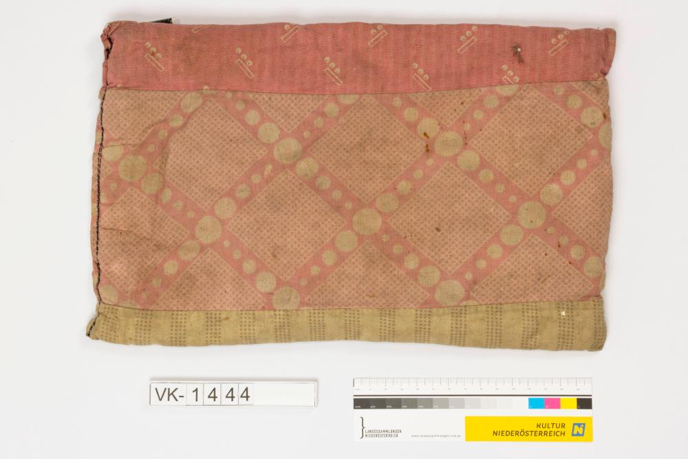 Kleiner Polster aus verschieden gemusterten Baumwollstoffen (rosa und beige), gefüllt mit Kräutern. Puppen- oder Kinderpolster.