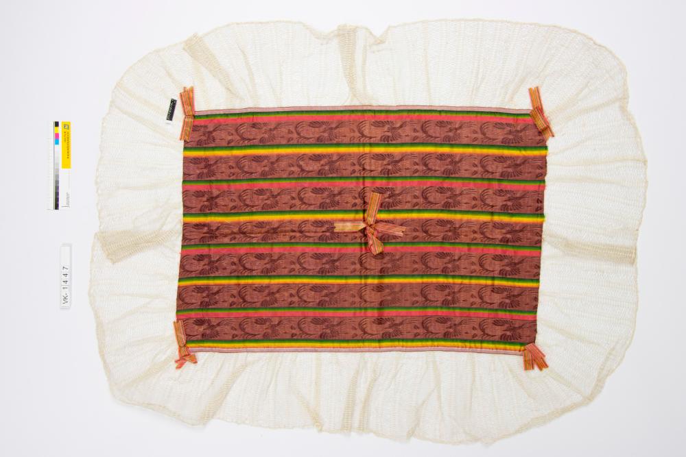 Rosa, gelb, grün und rot gestreifte Seidenbrokatdecke, gefüttert mit rosa Baumwollchintz, am Rand mit einer breiten Filetspitzenrüsche eingefasst. Die Decke ist mit Maschen aus mehrfärbig gestreiftem Seidenband verziert.