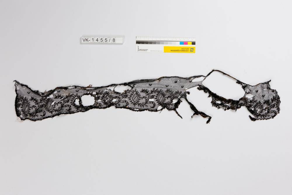 Ein Stück schwarzer Tüllspitze mit floralem Muster.