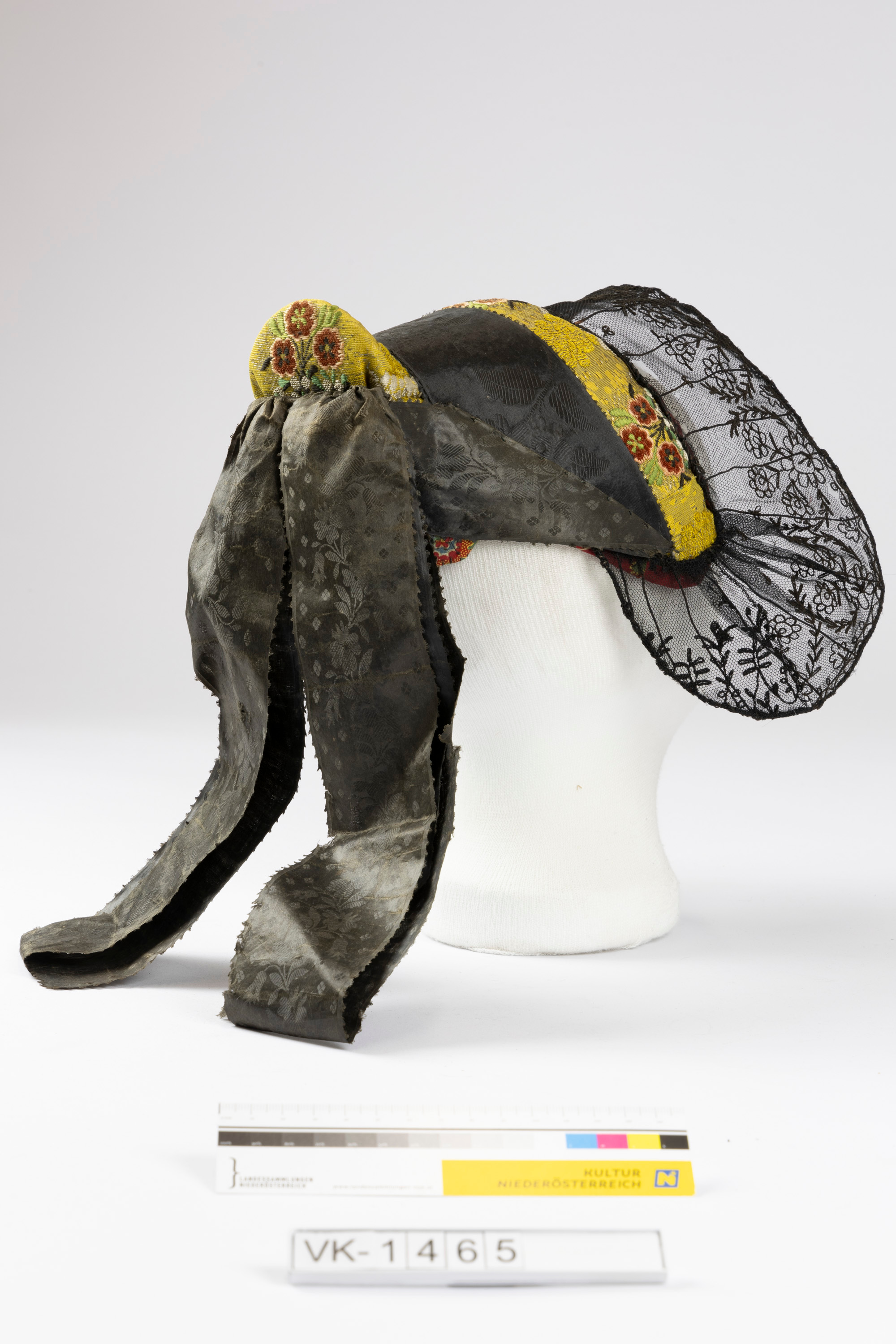 Hornputzhaube (Saurüsselhaube) aus geblümtem Goldbrokat, mit einem schwarzen Duchesseband mit Schleife. Die Haube hat einen breiten schwarzen Tüllspitzenschirm mit Drahtverstärkung (Gimpe) und ein blaues Leinenfutter.