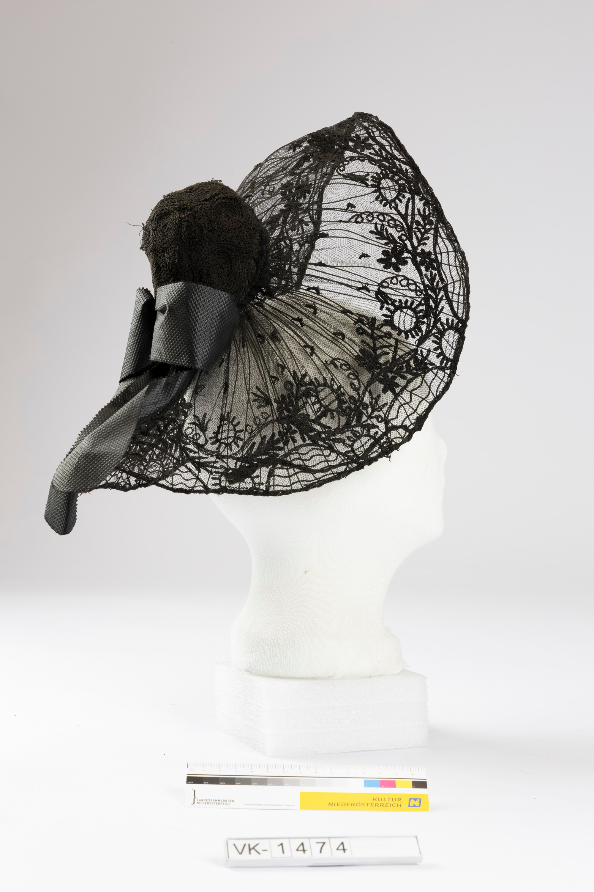 Drahtverstärkte Linzer Haube aus schwarzer Tüllspitze, am Böndel aus schwarzer Guipurspitze. Unter dem Böndel hat die Haube eine Schleife aus schwarzem geprägtem Papier.