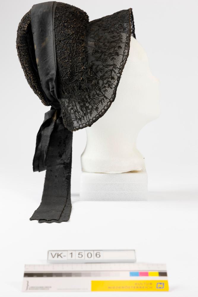 Drahtverstärkte Wiener Haube aus schwarzer Tüllspitze und einem breiten schwarzen Ripsband. Der Schirm ist aus schwarzer Tüllspitze ("Gimpe").