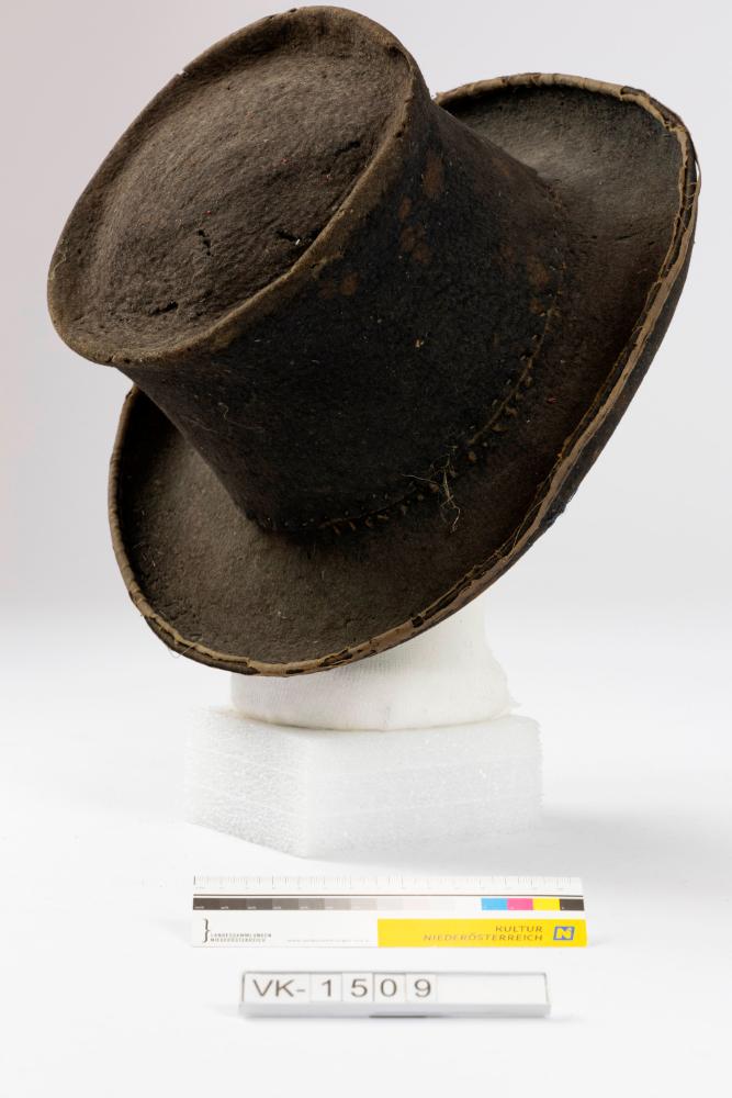 Schwarzer Filzzylinder mit aufgebogener Krempe, teilweise mit braunem Leder gefüttert.