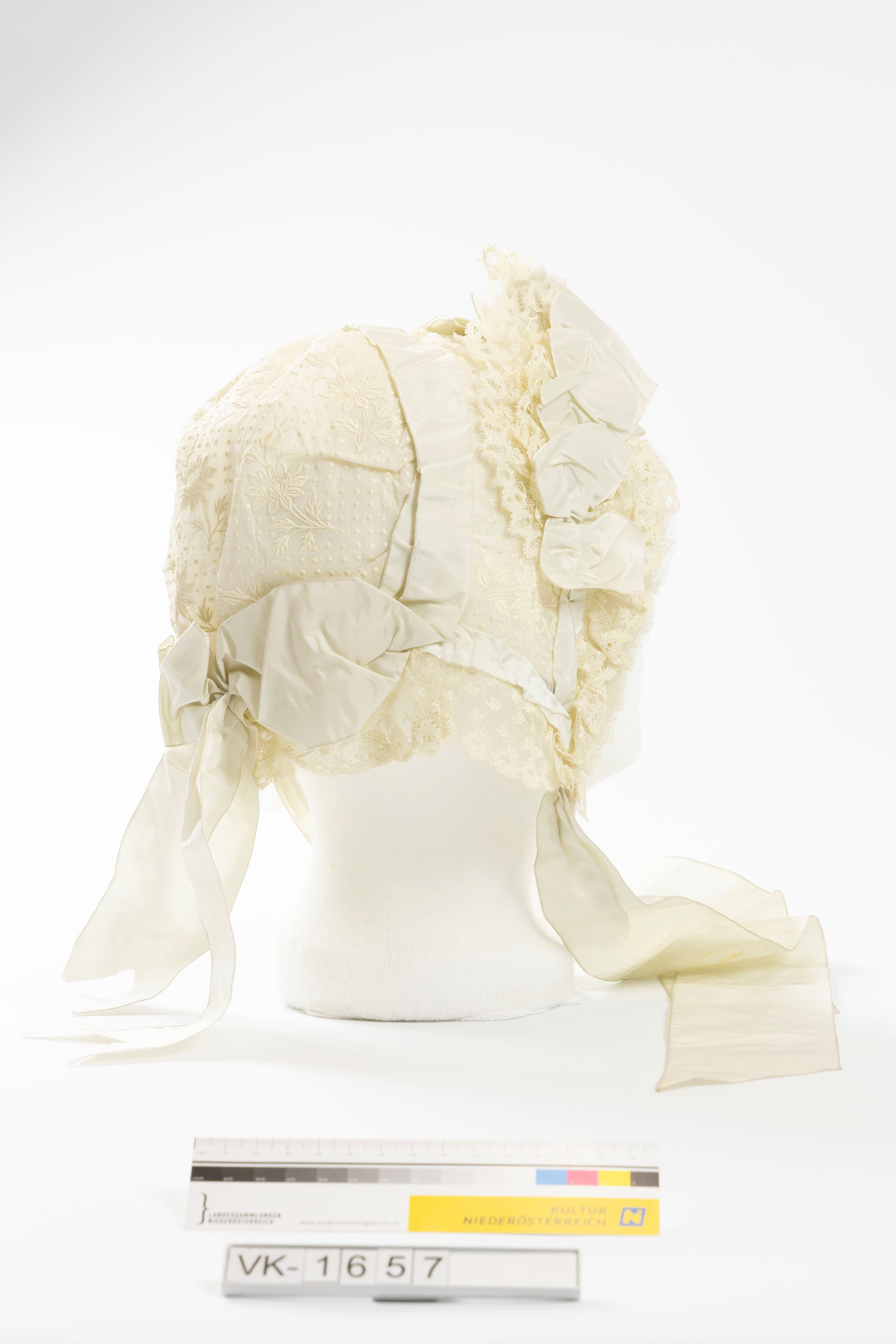 Bodenhaube mit Nackenzugband und Nackenschleife aus weißem Rips, am Kopfteil mit Tüllspitze und Rüschen verziert, zusätzlich mit Klöppelspitze. Laut Inventarbuch ehemalige Leihgabe.