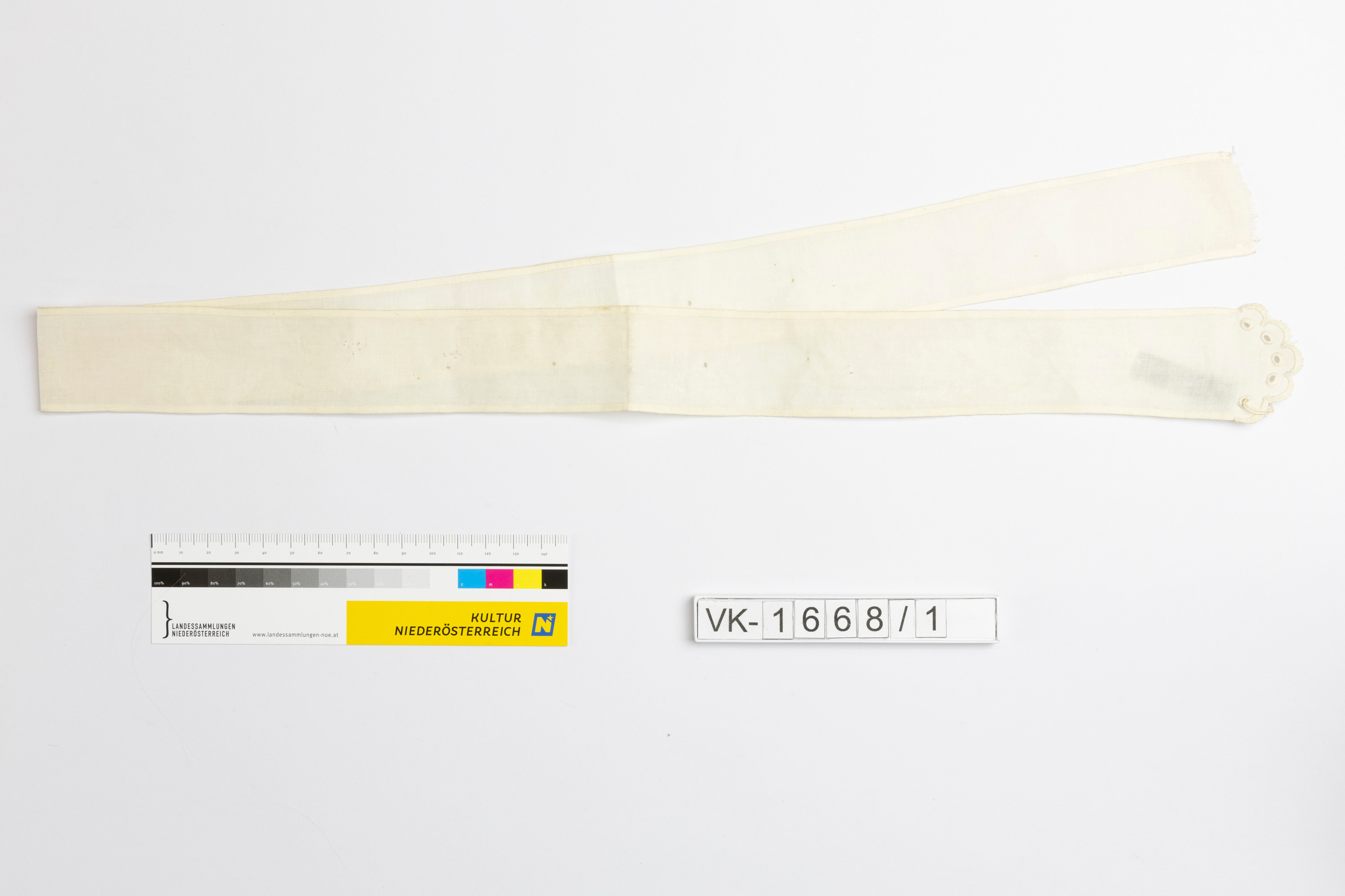 Weißes Glasbatistband, ein Ende abgeschnitten, am anderen Ende mit bogenförmigem Abschluss und Lochstickerei. Laut Inventarbuch eine Chemisette mit Krawatte und zwei Ärmeln von Fr. Frühwirth. Das Objekt ist eine ehemalige Leihgabe.