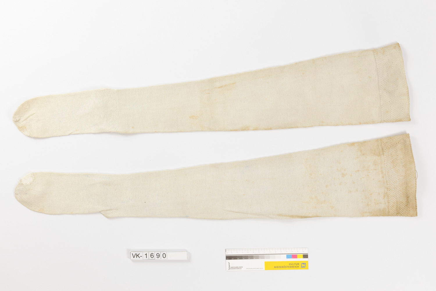 Ein Paar weiße Stutzen (a, b).