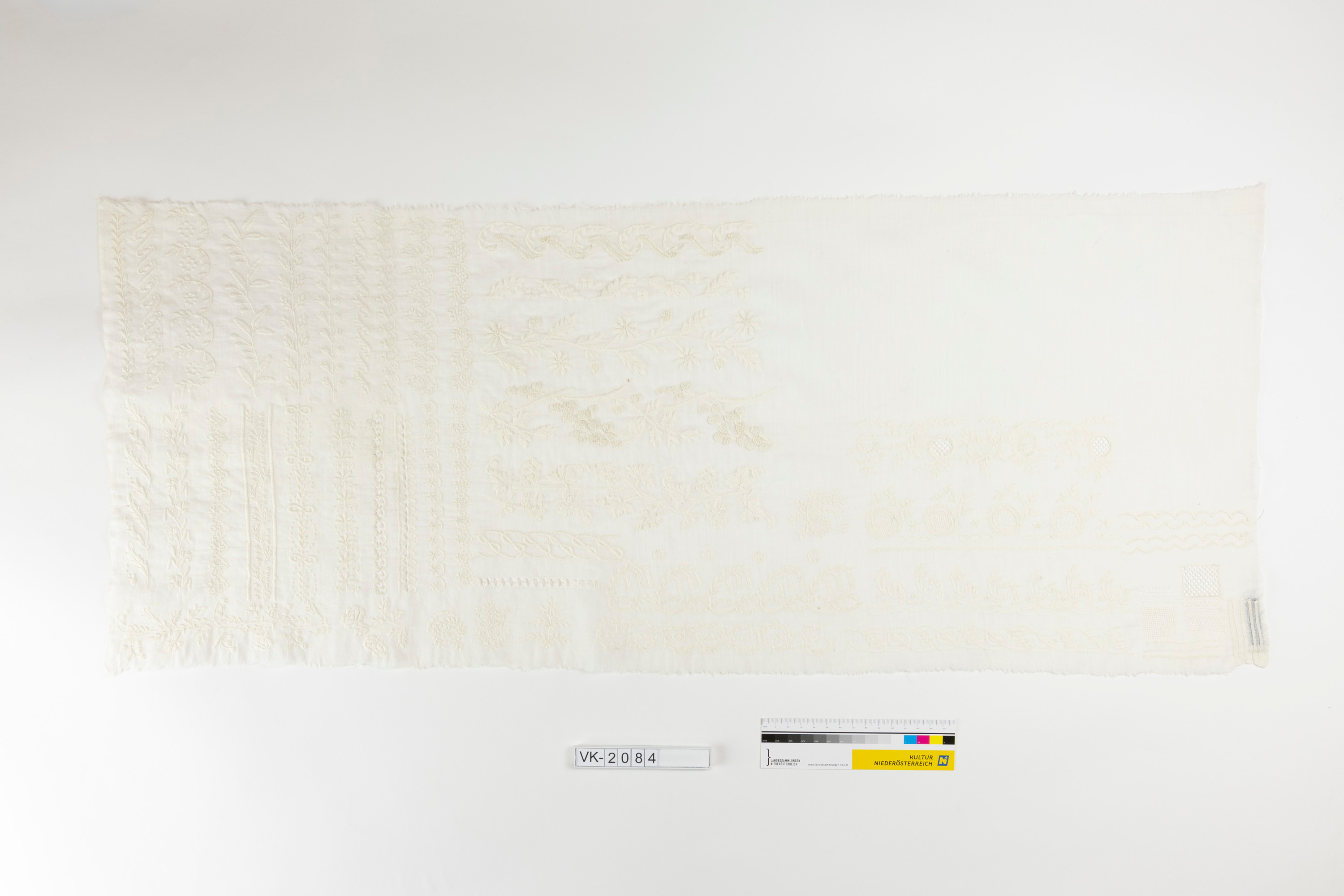 Feiner Leinenstoff, annähernd rechteckig, bestickt mit verschiedenen floralen und geometrisch gemusterten Stickborten, teilweise durchbrochen ausgeführt (Ajour), mit weißem Garn.