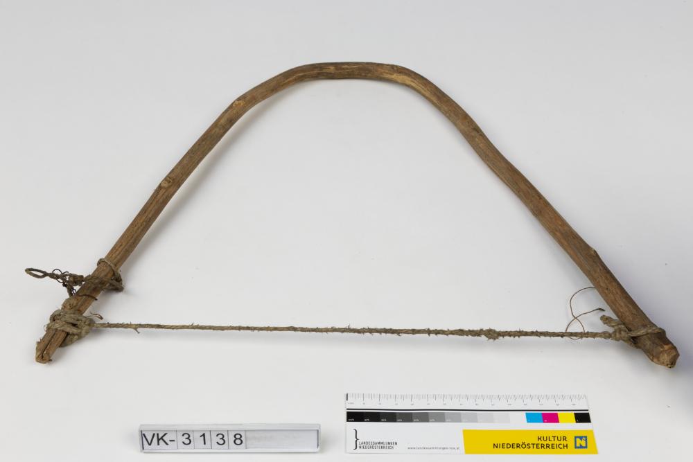 Gebogener Holzbogen mit einer Schnur als Sehne. Laut Inventarbuch für "Pfitsipfeile".