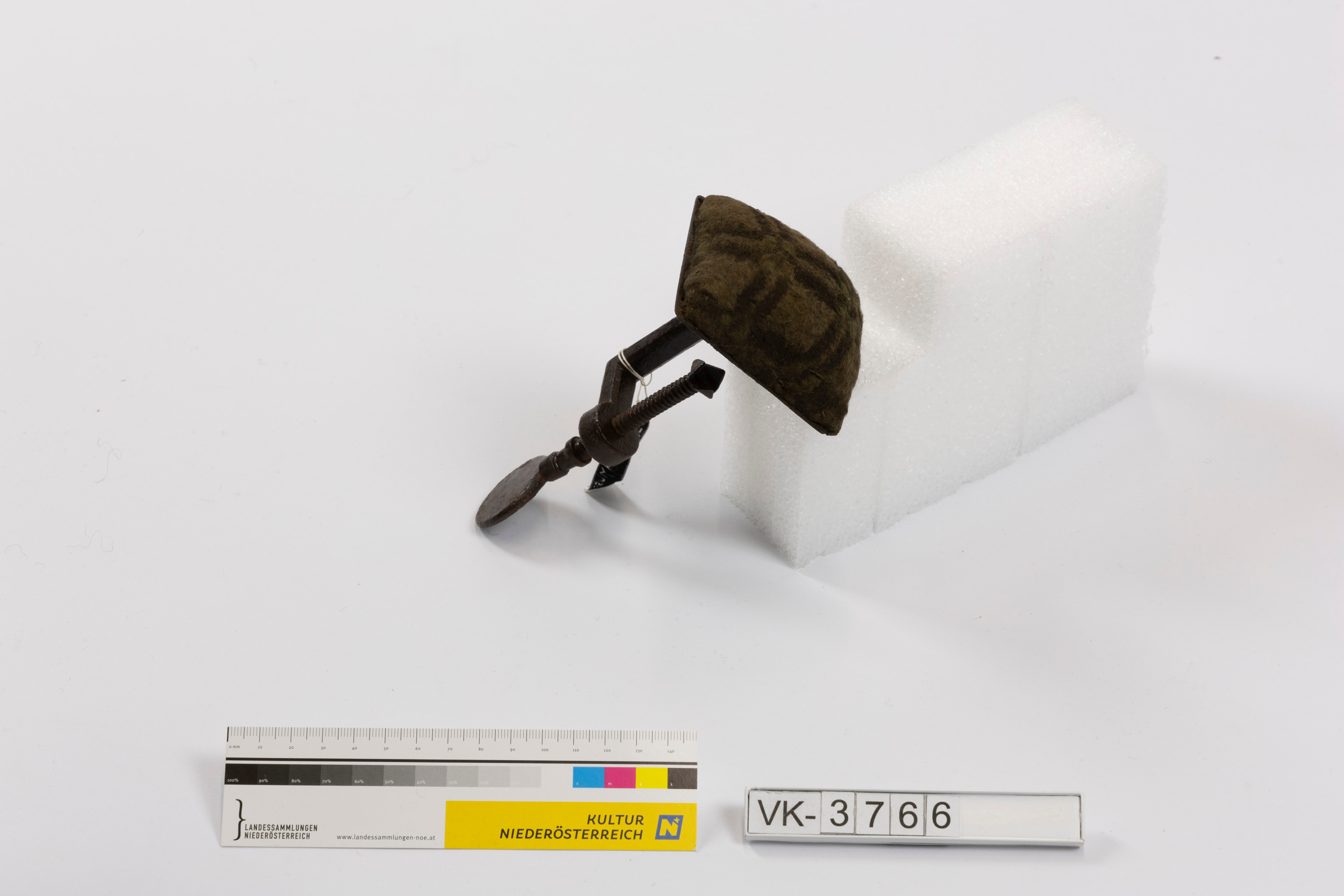 Nähpolster auf einer Metallplatte mit Schraubzwinge zur Tischbefestigung.