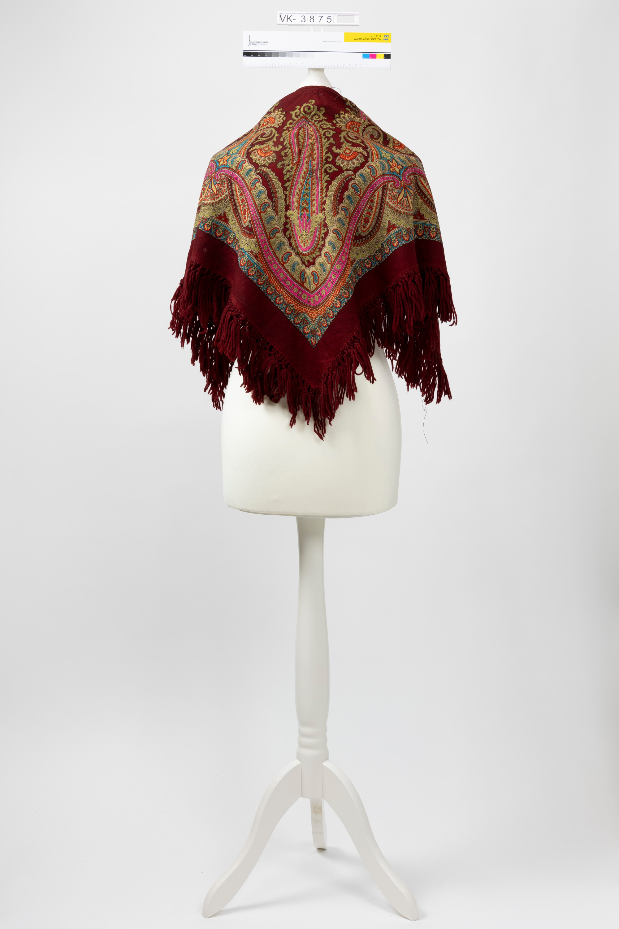 Großes weinrotes Schultertuch mit geknüpften Fransen und großflächigem, mehrfärbigem (beige, blau, orange, rosa), ornamentalem Dekor.