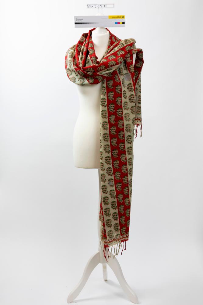 Rot-weiß gestreiftes Tuch mit Fransen an den Schmalseiten, Blütenmuster am Rand und kleinen mit Blüten besetzten Paisleyelementen.
