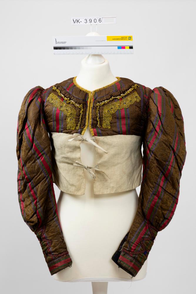 Kurzer langärmeliger Spenzer mit rundem Halsausschnitt und Hakenverschluss. Der Spenzer hat ausgeprägte Schinkenärmel und ist aus einem braun, rot und violett gestreiften Seidenbrokat gefertigt. Die Jacke ist mit beiger Baumwolle gefüttert, im unteren Bereich steht der Futterstoff vor (wurde im Kittel getragen). Auf der Brust befindet sich eine Verzierung mit goldfarbener Borte.