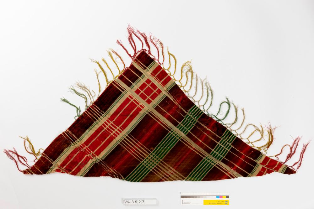 Dreieckiges Schultertuch aus rot, grün und beige kariertem Baumwollsamt, an zwei Stellen gestückelt. An den zwei kürzeren Seiten hat das Tuch Fransen in den drei Farben des Stoffes.