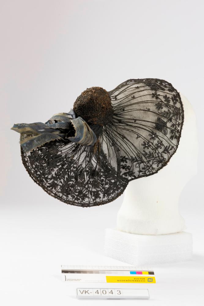 Drahtverstärkte Linzer Haube aus schwarzer Tüllspitze, am Böndel aus schwarzer Guipurspitze. Unter dem Böndel hat die Haube eine Schleife aus schwarz und braun gestreiftem Taft.