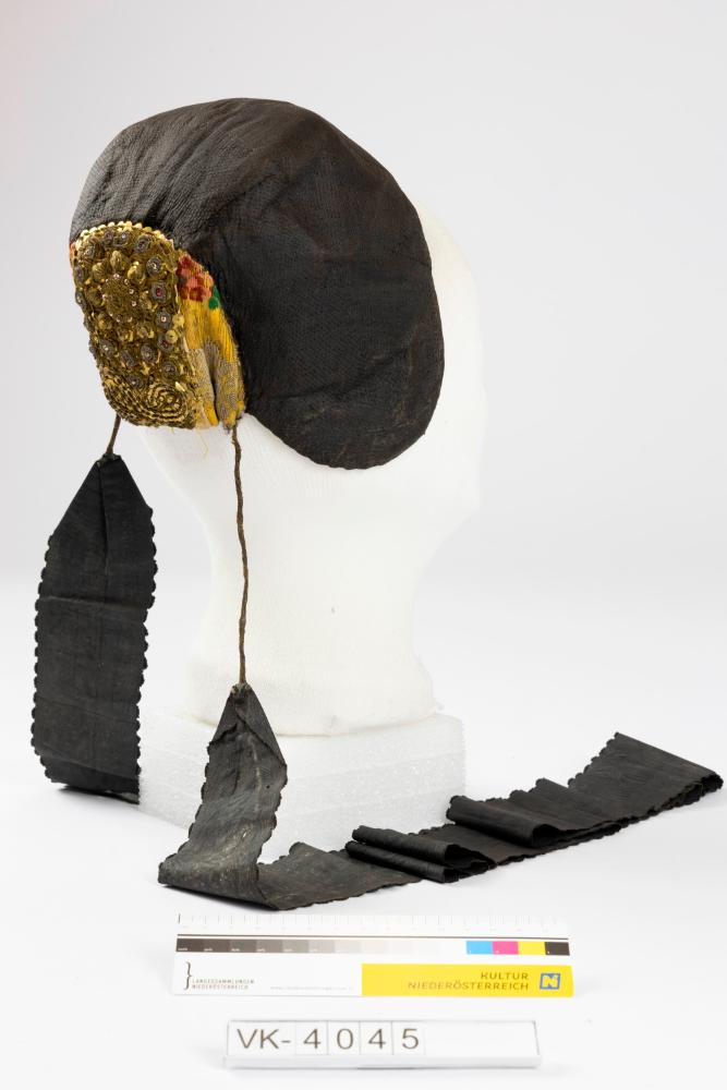 Bodenhaube, mit Boden aus gemustertem Goldbrokat, mit Golddraht und Pailletten bestickt, am Kopfteil glatt aus schwarzem Moiree mit abgerundeten Wangenklappen, zwei Moireebänder.