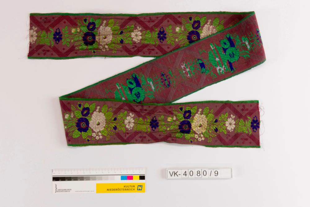 Seidenbrokatband (möglicherweise Männerhalsbündel), rosa mit grünem Rand und einem Blütenmuster in weiß, violett und grün.