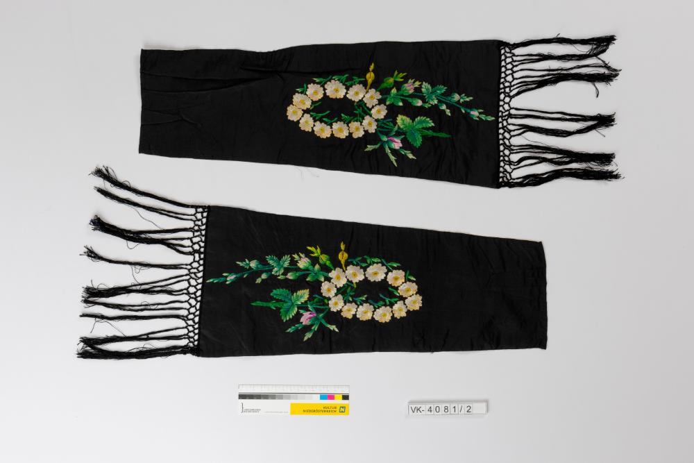 Zwei schwarze trapezförmige Schleifenbänder (a, b) mit einem mehrfärbig gestickten ovalen Blütenkranz mit Blattwerk und geknüpften und vernetzten schwarzen Fransen.