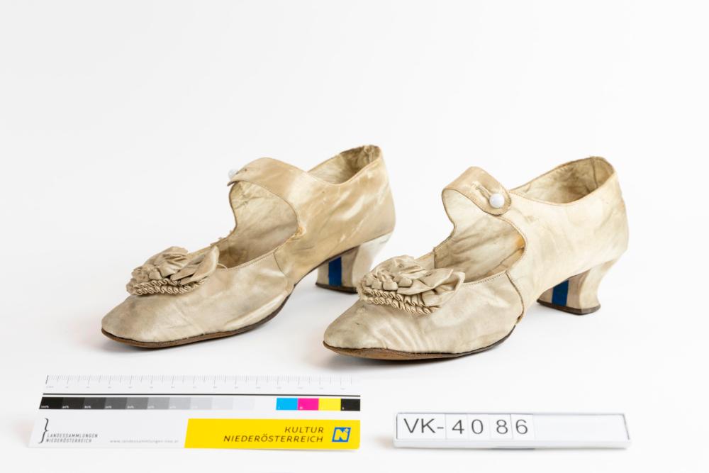 Ein Paar (a, b) beige flache Duchesseschuhe mit niedrigem Barockabsatz und einer Ristspange mit Knopf. Die Schuhe haben am Vorderblatt eine herzförmige Masche aus gefälteltem Duchessestoff.