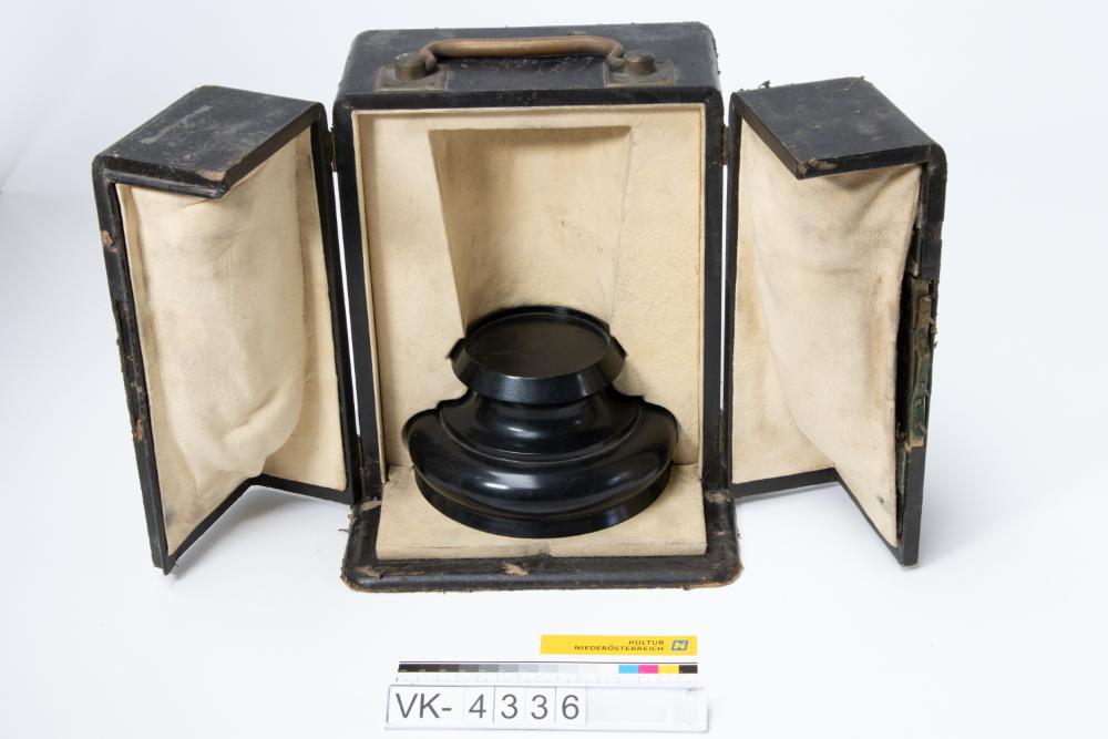 Lederbezogene Kiste (VK-4336c) mit zwei Türen und einem Griff. Im Inneren des Behälters ist eine Aussparung für einen Pokal (nicht vorhanden) und dessen Holzsockel (VK-4336b) eingelassen.