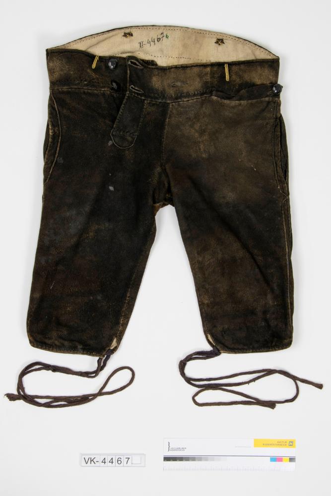Knielange Lederhose mit Messinghaken für die Hosenträger, seitlichen geknöpften Taschen und Bändern an den Beinabschlüssen.