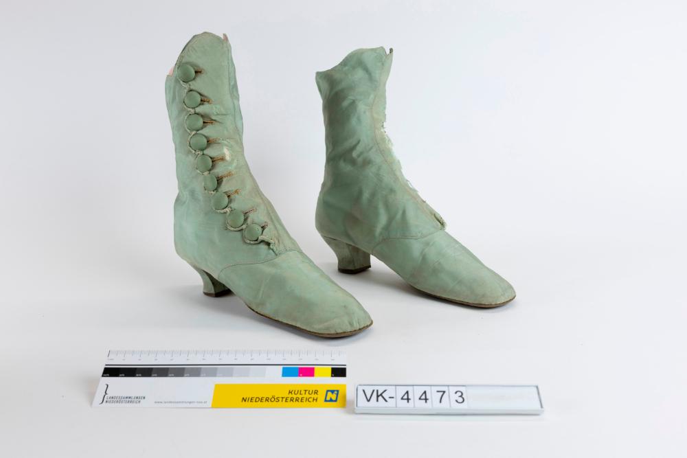 Ein Paar knöchelhohe Damenschuhe (a, b) aus hellgrüner Seide mit Absatz und Ledersohle, mit einer Knopfleiste verschlossen.